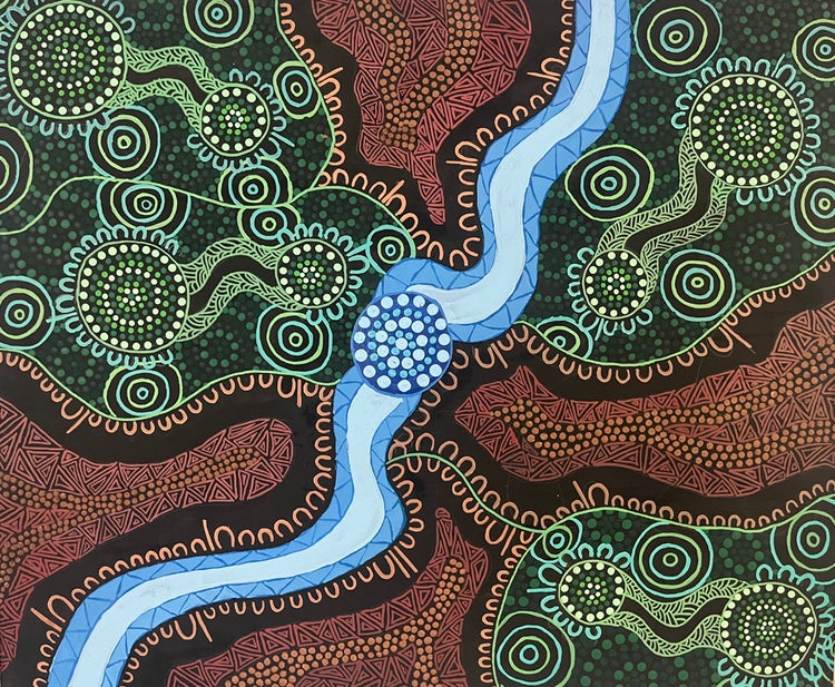 The image featured here is a meaningful artwork created by Amarni, a former DPPS student, who painted it especially for our school. Her artwork beautifully reflects the connection between our school, our community, and the rich Wiradjuri Country on which we learn and grow.